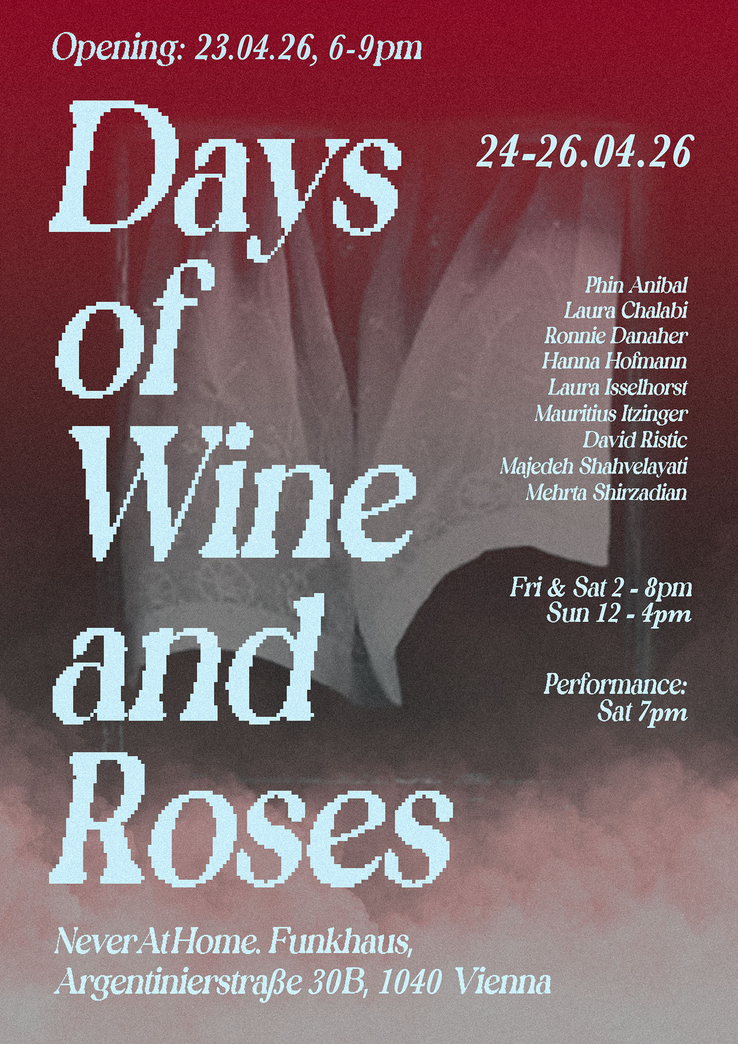 A warm invitation to the opening of the exhibition 'Days of Wine and Roses' with works from Art & Science students (2nd years), taking place on Thursday 23 April at 18:00 at NeverAtHome, Funkhaus (Argentinierstraße