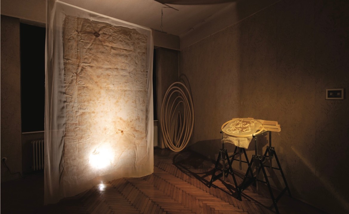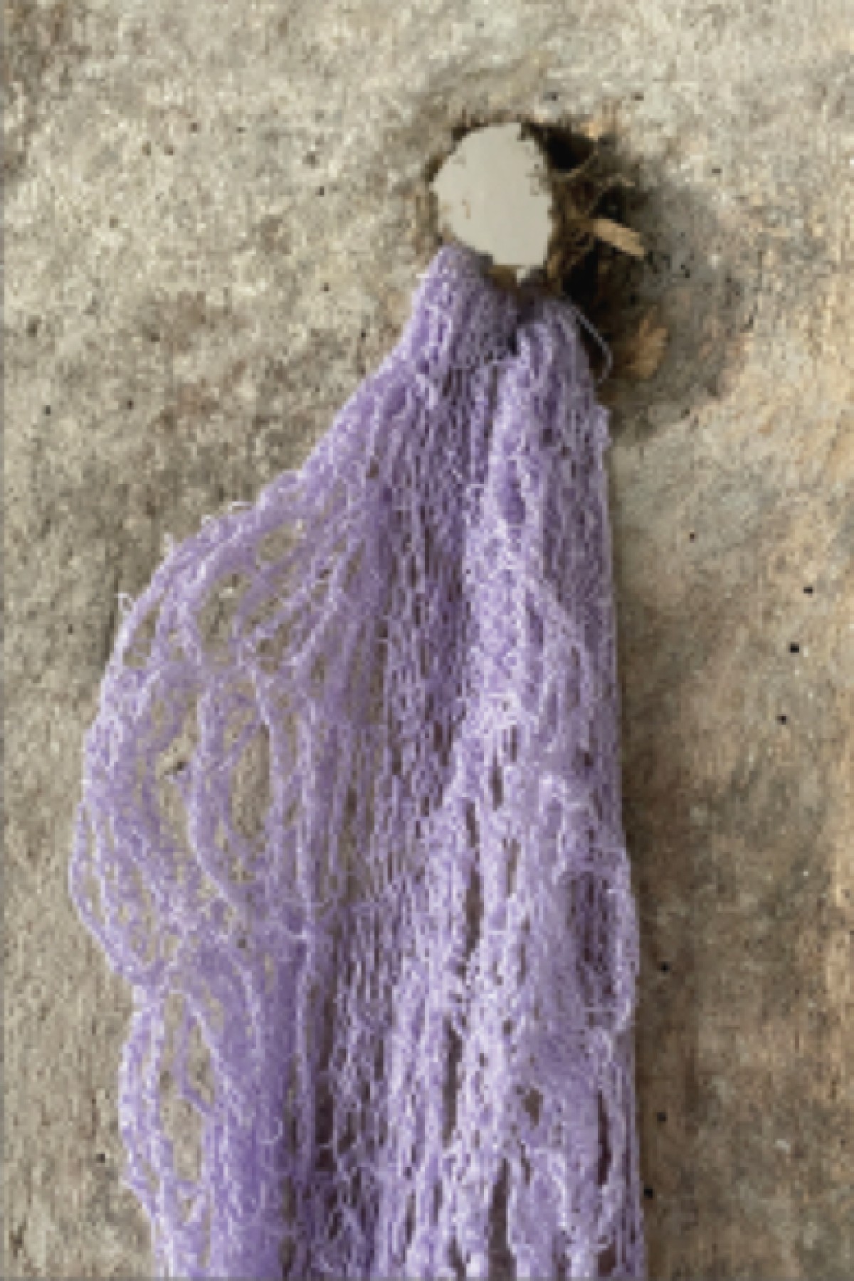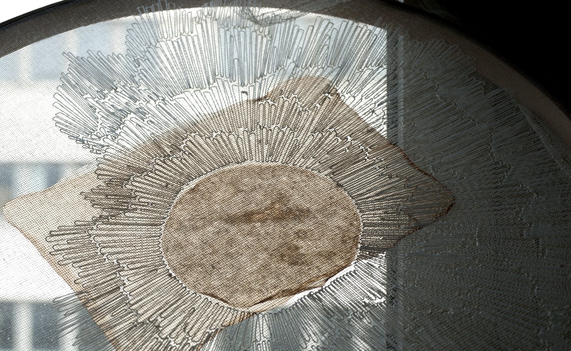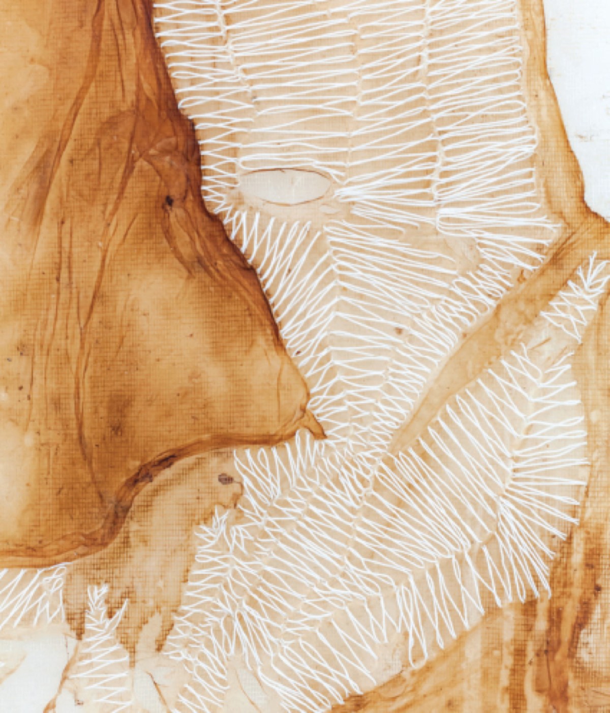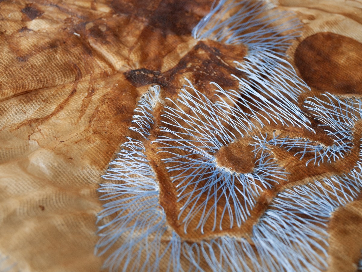Tarlatan, dried bacterial cellulose, embroidered salvaged cotton thread. 105 x 52 cm