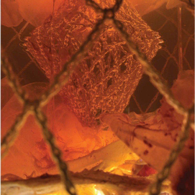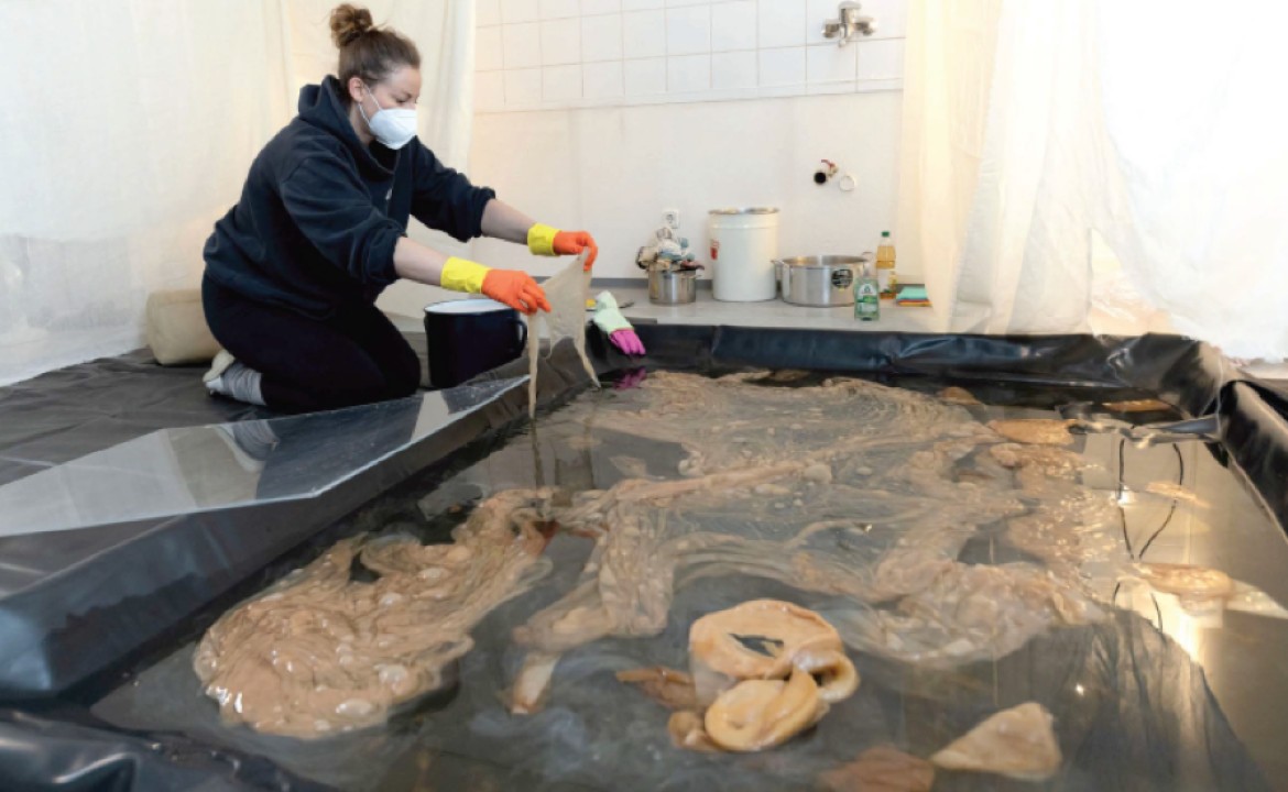 Below: Passenger VI (detail), 2023, Salvaged glass vitrine and chrome stand, live bacterial cellulose and Geburtsvorbereitungstee tea culture, crocheted dead stock thread. Both from the Guts of my Guts - Series. Photo © Anni Kathrin Elmer