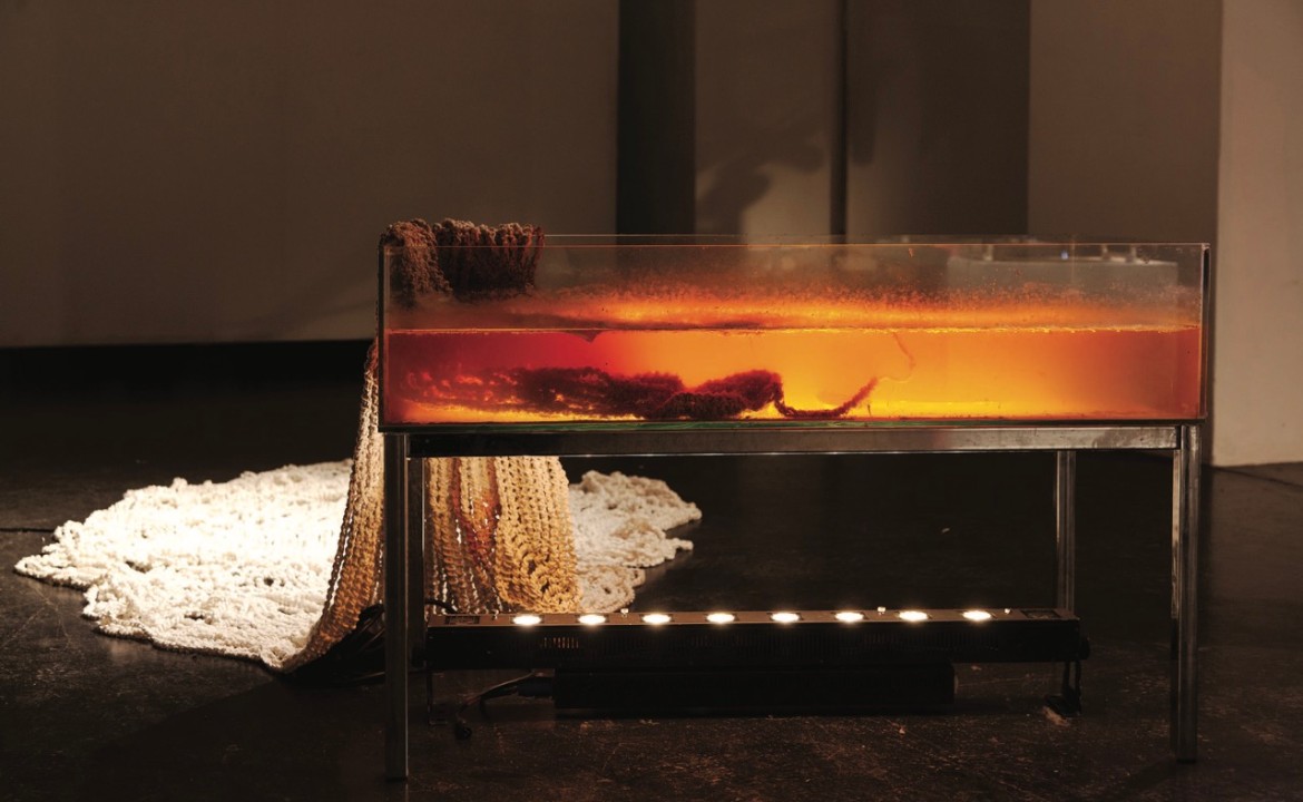 Hand-crocheted organic unbleached cotton cord, salvaged glass vitrine and metal stand, mirror, bacterial cellulose, fermenting